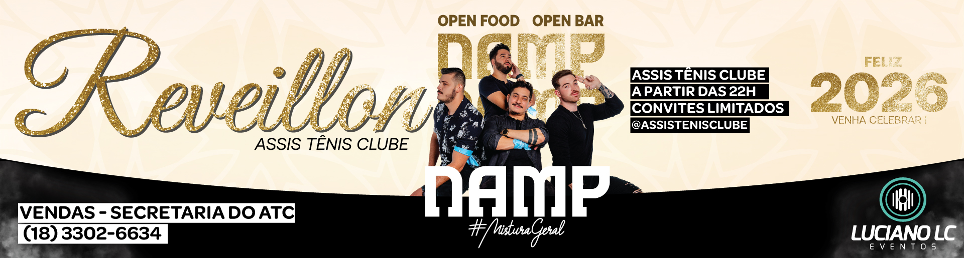 Para garantir a animação, teremos a Banda NAMP e o DJ Luciano LC comandando o som a noite toda. Além de um jantar completo, oferecemos um Open Bar selecionado com cerveja, refrigerante, água, espumante, moscatel e Whisky Black Label.